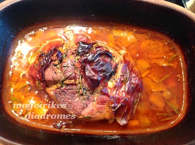- Σκεπάζουμε την γάστρα με το καπάκι βάζουμε σε ζεστό φούρνο στους 180-200 βαθμούς για 3 ώρες να ψηθεί. Όταν ψηθεί το κρέας, σβήνουμε τον φουρνο. Βγάζουμε το κρέας από την γαστρα το βάζουμε σε μια πιατέλα και ξανά στο ζεστο φουρνο.