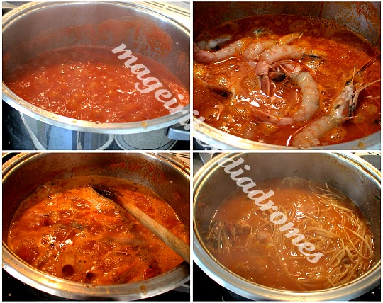 - Αφαιρώ τον αστακό ή τις γαρίδες και μέσα στη σάλτσα προσθέτω νερό τόσο όσο να βράσουν τα μακαρόνια και να πιουν όλο τους το νερό .