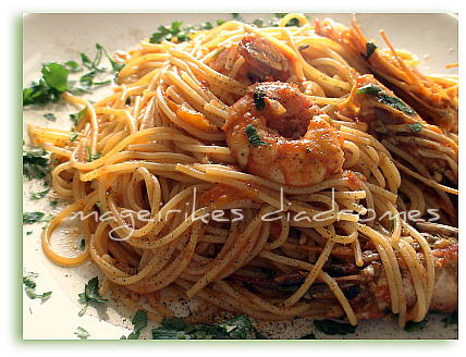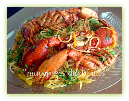 - Προς το τέλος (2-3 λεπτά ) ρίχνω και τον αστακό ή τις γαρίδες μαζί με ψιλοκομμένο μαϊντανό να πάρουν μια βράση και κατεβάζω από τη φωτιά .