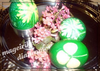 - Κόβουμε φύλλα σε όμορφα σχέδια και τα κολλάμε επάνω στα αυγά.