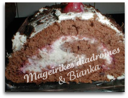 - Τυλίγουμε το ρολό, γαρνίρουμε με την υπόλοιπη σαντιγί και με την σοκολάτα, βάζουμε τα κεράσια επάνω και το βαζουμε στο ψυγείο μέχρι να το σερβίρουμε
