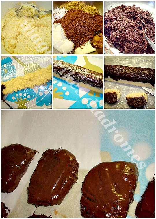 - Για το μείγμα σοκολάτας: Ανακατευουμε ολα τα υπολοιπα υλικα της συνταγης μας και πλαθουμε μια ζυμη. Πανω σε μεμβρανη στρωνουμε το μειγμα ινδοκαρυδου, απο επανω βαζουμε το μειγμα σοκολατας, κλεινουμε καλα μεσα στην μεμβρανη και δινουμε σχημα μπαστουνιου. Βαζουμε στην καταψυξη 2-3 ωρες και μετα κοβουμε σε καριοκακια- φετούλες.
