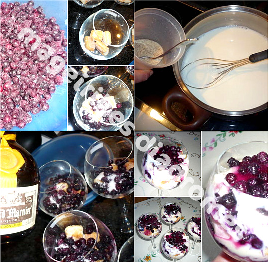 Παίρνουμε ποτήρια και βάζουμε μια στρώση σαβαγιαρ . Ραντίζουμε με το λικέρ . Μια στρώση από τα φρούτα και πασπαλίζουμε με ζάχαρη .