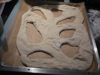 Σε παγκο εργασιας πασπαλιζουμε αλευρι, παίρνουμε το ενα μπαλακι και ανοιγουμε σε ενα φυλο οχι στρογγυλό αλλα να εχει το σχήμα οβαλ. Τωρα κοβουμε με ενα μαχαιρι τρυπουλες σε διαμερτο 5 ποντους που με τα δαχτυλα τις μεγαλωνουμε λιγο.