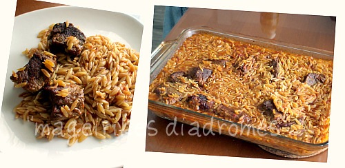 - Μεταφέρω το κρέας στο πυρέξ. Μετρώ τη σάλτσα και συμπληρώνω με ζεστό νερό. Πρέπει η αναλογία να είναι 1 φλ/νι κριθαράκι με 3 φλ/νια νερό και σάλτσα (κρέατος)περίπου. Αρχίστε με1 προς 2,5 φλ/νια και συμπληρώνετε ζεστό νερό, αν χρειαστεί. Διορθώνω το αλάτι. Βάζω το υπόλοιπο λάδι και το κριθαράκι και το ανακατεύω καλά.