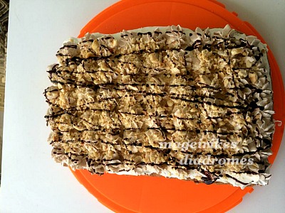 - Ψήνουμε στους 180 βαθμους για 25-30'. Εμενα το ταψί μου ηταν 30 Χ 40 και έκοψα το γλυκο στη μεση και εβαλα το ενα πανω στο άλλο.