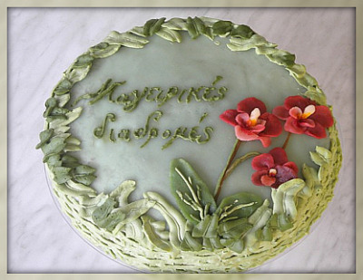 Στολίζουμε την επιφάνεια με την υπόλοιπη αμυγδαλόπαστα και τα σχέδια που έχουμε φτιάξει, τις ορχιδέες, τα κοτσανάκια και τα φύλλα. Χρωματίζουμε τα λουλουδάκια με κίτρινο και κόκκινο χρώμα, με τη μύτη της οδοντογλυφίδας. Στολίζουμε τα τελειώματα με την ειδική μύτη του κορνέ που βγάζει φύλλα και στις δύο αποχρώσεις του πράσινου.