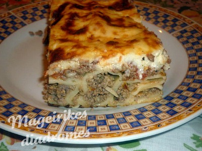 - Σκορπίζουμε ανάμεσα τον περίσσιο κιμά. Περιχύνουμε με την σάλτσα ντομάτας,και απο πάνω βάζουμε κουταλιές ,κουταλιές την κρέμα με βρεγμένο κουτάλι για να μην ξεσηκώσει την σάλτσα.