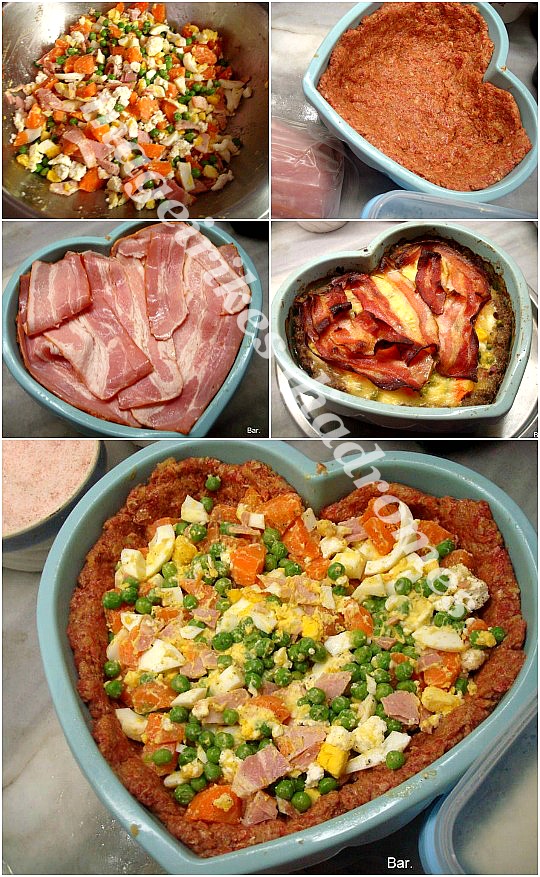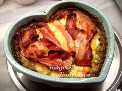 - Ετοιμαζουμε τα υλικα της γεμισης ψιλοκομμενα, γεμιζουμε και σκεπαζουμε με φετες γκουντα, απο επανω σκεπαζουμε με μπεϊκον.