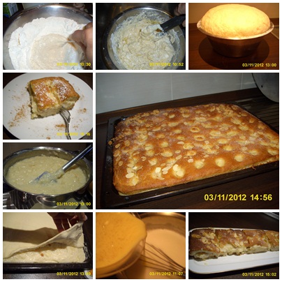 - Το αφηνουμε για 30 λεπτα να φουσκωσει. Τωρα πιεστε τη ζυμη , σε λακουβίτσες (Να μην το τρυπήσετε) και βαλτε επανω 75 γρ βουτυρο, σε νιφαδες- κομματάκια. Με ενα κουταλακι βαζουμε και την κρεμα βανιλια πουτιγκα, πασπαλιζουμε ζαχαρη και αμυγδαλα.