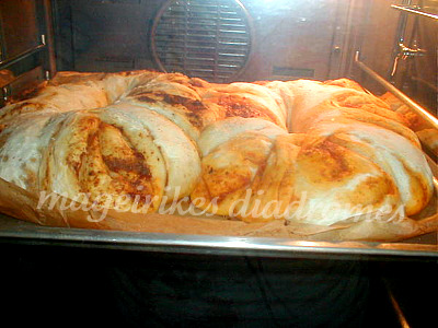 Το τυλίγουμε σε ρολό, το βάζουμε στην φόρμα το αλείφουμε λίγο με βούτυρο και το αφήνουμε να ησυχάσει για 10 λεπτά και μετά ψήνουμε για 50-60 λεπτά