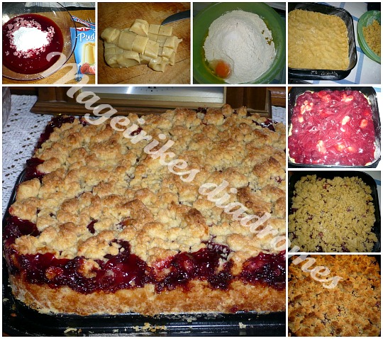 Παίρνουμε το 2|3 απο την ζυμη και την βαζουμε στην φορμα, το παταμε να παη και λιγο στα πλαγια, ριχνουμε μεσα τα κερασια και απλωνουμε να πανε παντου, την υπολυπη ζυμη την πασπαλιζουμε επανω στα κερασια