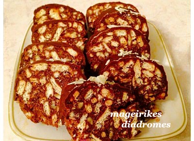 - Χωρίζουμε τη ζάχαρη σεδυο μπωλ, στο ενα βάζουμε τα ασπραδια, στο αλλο τους κροκους και τα χτυπαμε. Τα ενώνουμε και τα ζεματαμε με το βιταμ, με τους κροκους χτυπαμε και το κακαο, ρίχνουμε το μιγμα στα μπισκοτα.