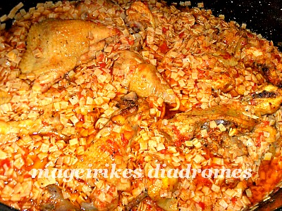 - Σοτάρουμε στο λάδι το κοτόπουλο με το ψιλοκομμένο κρεμμύδι. Προσθέτουμε τον πελτέ και το κονκασέ, και σοτάρουμε για λίγο ακόμα αφού χαμηλώσουμε τη φωτιά. Ρίχνουμε καυτό νερό να σκεπαστεί το φαγητό, αλάτι , πιπέρι, ξύλο κανέλας και μπαχάρι. Βράζουμε το κοτόπουλο, και αφού είναι έτοιμο και έχει μείνει με ελάχιστη σάλτσα, το βγάζουμε σε μια πιατέλα.