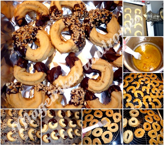 - Στη συνέχεια, περναμε τη ζύμη μέσα από μια μηχανή κοπής κιμά με την φορμιτσα του μπισκότου αστέρι. Κόψτε μικρά κομμάτια και καντε το σχήμα σε μισοφέγγαρα και κυκλους. Αν δεν εχετε μηχανη, βαζετε τη ζυμη στο κανονικο μηχανημα που κανετε τα μπισκοτακια.