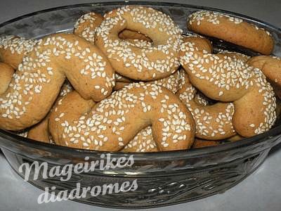 - Πλάθουμε τα κουλουράκια σε σχήμα 0 η S ,τα τυλίγουμε σε σουσάμι και τα ψήνουμε στους 175 βαθμούς για 15 περίπου λεπτά , να ροδίσουν.