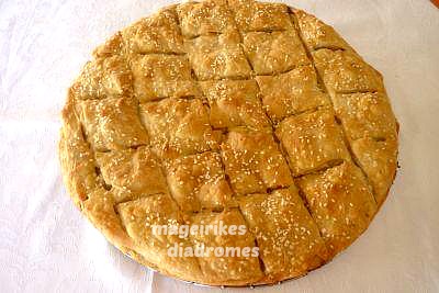- Αλείφουμε με τον χτυπημένο κρόκο ,πασπαλίζουμε με σουσάμι και ραντίζουμε ελάχιστα με νερό. Ψήνουμε την πίτα μας στους 180 βαθμούς περίπου 45 λεπτά.