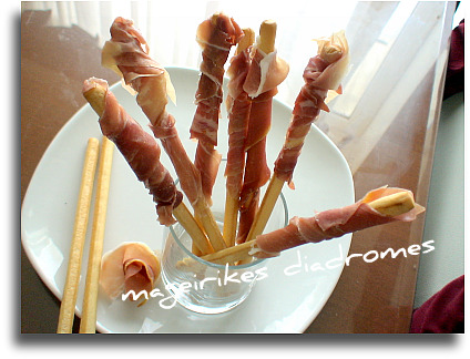 - Παίρνουμε το κάθε κριτσινάκι και τυλίγουμε πάνω της και λοξά το κάθε κομμάτι προσούτο.
