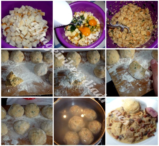 - Αλευρωνουμε τον παγκο εργασιας και πλαθουμε τα μπαλακια ψωμι . Πλάθουμε 7-8 μπαλακια, τα ριχνουμε σε ελαφρα αλατισμενο βραστό νερό για 20 λεπτά. Το νερό δεν πρέπει να βράζει! Όταν βγουν στην επιφάνεια, ειναι ετοιμα.