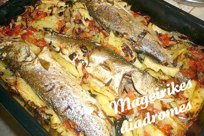 Λαυράκια στο φούρνο με λαχανικά