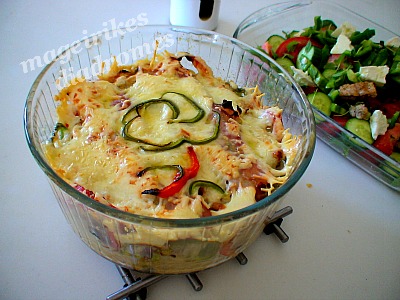Μια μακαρονάδα φούρνου που τρώγαμε παλιά στις πιτσαρίες και τα ιταλικά ρέστοραν. Ήταν σε πήλινα γιουβετσάκια και ατομικές μερίδες. Τη θυμήθηκα γιατί ήθελα να αξιοποιήσω τα περισσεύματα από μακαρόνια και κιμά, ώστε να έχουμε ένα νόστιμο και φρέσκο και νέο φαγητό.