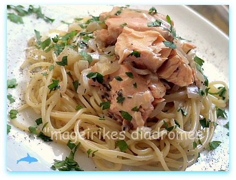 - Στο τέλος βάζουμε και το σολομό να πάρει μια βράση. Mπορούμε αν θέλουμε να το διαλύσουμε το σολομό στη σάλτσα.