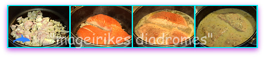 - Βάζουμε στο τηγάνι βούτυρο ή λάδι, το κρεμμύδι και πάνω σε αυτό το σολομό ,αλάτι και πιπέρι (όχι τσιγάρισμα).