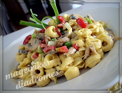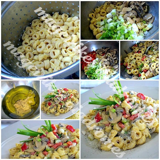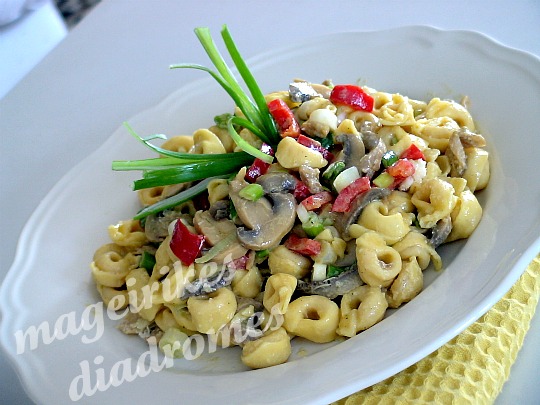 - Βράζουμε τα τορτελίνια σύμφωνα με τις οδηγίες, αλλά 1 ή 2 λεπτά λιγότερο. Τα στραγγίζουμε και τα ρίχνουμε σε κρύο νερό. Τα σουρώνουμε και τα βάζουμε σε μπολ.