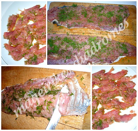 - Bάζουμε μέ τήν σειρά επάνω στά φιλέτα τά υλικά όπως τά γράφω, στό τέλος βάζουμε επάνω καί τόν άνηθο έτσι ολόκληρον