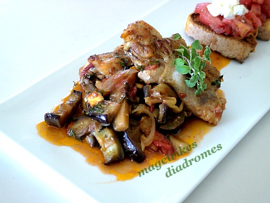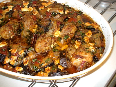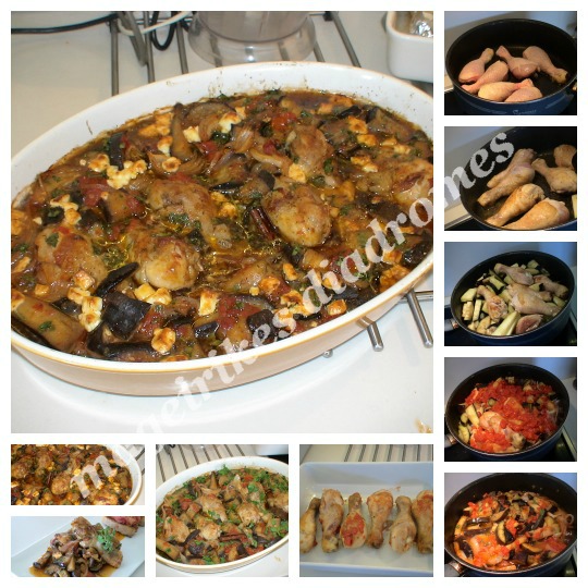 - Αφήνω για λίγο στη φωτιά και ανακατεύω μια φορά το μείγμα. Βγάζω το κοτόπουλο σε ταψί και αφήνω λίγο ακόμα τη σάλτσα στη φωτιά. Διορθώνω το αλατοπίπερο, προσθέτω λίγη ζάχαρη και προσθέτω το μείγμα της μελιτζάνας στο ταψί μας.
