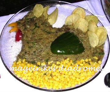 - Σε μια πιατέλα στρώνουμε όλη τη μελιτζανοσαλάτα φτιάχνοντας το σχήμα της κότας.