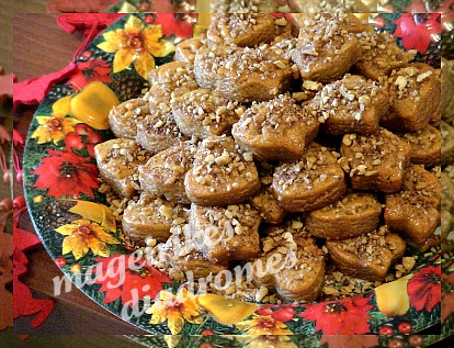 Όταν έχουν κρυώσει και είναι έτοιμα, τα βάζω σε στρώσεις σε πιατέλα και ανάμεσα ρίχνω το μείγμα που έχω ανακατέψει καρυδιού, κανέλας και γαρύφαλλου