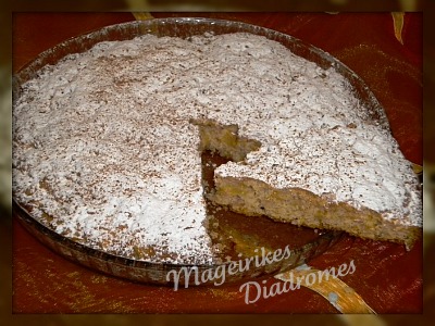 - Αφήνουμε να κρυώσει ελαφρά και πασπαλίζουμε την επιφάνεια με άχνη ζάχαρη και κανέλα.