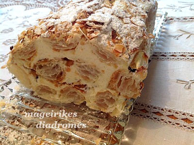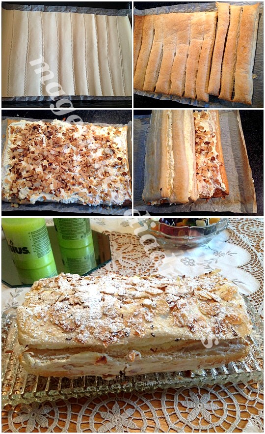 - Τυλιγω προσεχτικα σε ρολο και πασπαλίζω με αχνη και μερικά καβουρντισμένα αμυγδαλα