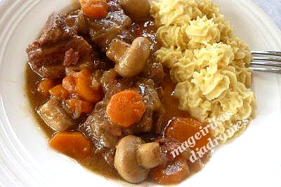 - Προσθέτουμε το περιεχόμενο του τηγανιού στην κατσαρόλα ,ανακατεύουμε καλά ,προσθέτουμε αλάτι και πιπέρι και βράζουμε για άλλα 15 λεπτά. Σερβίρουμε με σπιτικό πουρέ και με ίδιο κρασί μαυτό που βάλαμε στο φαγητό.