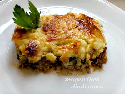 - Σε ένα ταψί ρίχνουμε λίγη τριμμένη φρυγανιά και στρώνουμε το μείγμα του κιμά .Πασπαλίζουμε με λίγο τυρί τριμμένο. Ρίχνουμε την μπεσαμέλ την στρώνουμε και πασπαλίζουμε με τυρί.