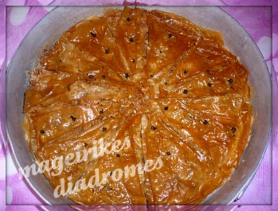 - Στο τέλος βάζουμε 2 φύλλα ζύμης κρουστας και κόβουμε τον μπακλαβά σε 9 η 10 κομμάτια, καρφώνουμε επάνω ένα καρφάκι γαρύφαλλο και ψήνουμε σε προθερμασμένο φούρνο στους 180 ° C στη μεσαία σχάρα για 30 λεπτά. η και περισσότερο, ώσπου να πάρει από πάνω και από κάτω ένα ωραίο χρώμα