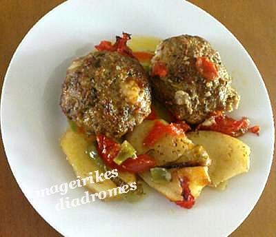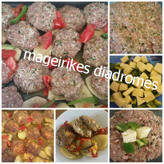 - Πλάθουμε μπιφτέκια, βάζουμε στο κέντρο τους κυβάκια τυριού και πιπεριάς, κλείνουμε καλά ζυμώνοντάς τα και τα τοποθετούμε στο ταψί πάνω από τις πατάτες.