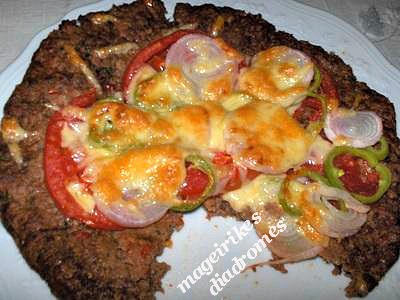 - Πλάθουμε τον κιμά σε πίτα πάχους 1 εκατοστού ανάμεσα σε δυο αντικολλητικές κόλλες και το μεταφέρουμε σε ένα ταψάκι. Ψήνουμε στο γκριλ για 7 λεπτά.