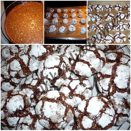 - Μετά κάνουμε μικρά μπαλάκια τά τυλίγουμε στήν άχνη καί τά τοποθτούμε σέ ταψί με λαδόκολα