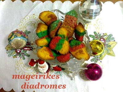 - Αν έχουμε σακούλες ζαχαροπλαστικής εφαρμόζουμε το κορνέ και βάζουμε σε φορμάκια με σχήματα Χριστουγεννιάτικα ή απλά σε χαρτάκια για μάφινς λίγο μείγμα κίτρινο,συνεχίζουμε με κόκκινο και τελειώνουμε με πράσινο,ή με όποια σειρά θέλετε εσείς τα χρώματα.