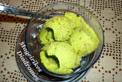 - Το βάζουμε στην κατάψυξη για 40 λεπτά. Στην συνέχεια το ανακατεύουμε απαλά με την κρέμα γάλακτος και προσθέτουμε προσεχτικά λίγο-λίγο χρώμα μέχρι να πετύχουμε το επιθυμητό ,και στην συνέχεια προσθέτουμε τα φυστίκια και το λικέρ.