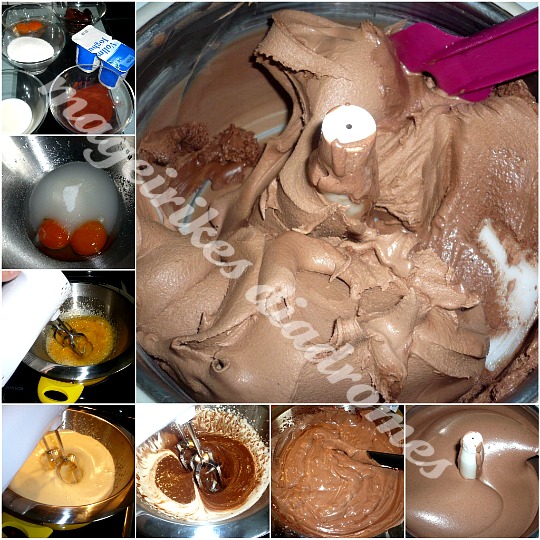 - Βάζουμε τους κρόκους με το νερο, ζαχαρη, το σιροπι και το γαλα σε μια λεκάνη. Βαζουμε την λεκανη σε μια κατσαρολα με νερο που βραζη η σε μπεν μαρι και χτυπαμε καλά με το μιξερ, ωσπου να εχουμε μια κρεμα λιγο ασπρη και κρεμωδης.