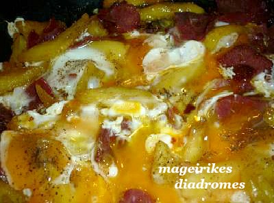 - Βάζουμε στο σαχανάκι το λάδι,τις τηγανισμένες πατάτες ,ρίχνουμε τα κομματάκια του παστουρμά.