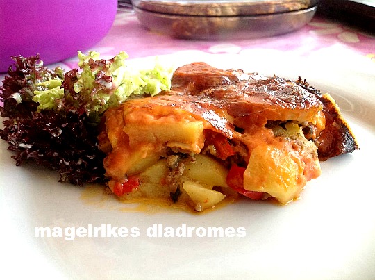 - Βουτυρωνουμε ένα πυρεξ. Βάζουμε μια στρώση πατάτες ,και βάζουμε επάνω από τον κιμά και τις πιπεριες. Ξανά μια στρώση πατάτες ,πιπεριες, κιμά. Τελειώνουμε με μια στρώση πατάτες.