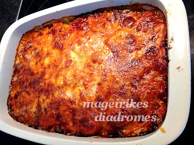 - Ρίχνουμε την μπεσαμελ ντομάτας επάνω στις πατάτες. Πασπαλίζουμε με το τυρι ,βάζουμε εδω εκεί λίγο βούτυρο ,και ψήνουμε σε ζεστο φουρνο στους 200 βαθμούς για 25 λεπτα.