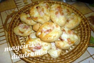 - Παίρνουμε μικρά κομμάτια ζύμης τα πλάθουμε σαν μικρές βαρκούλες ,που τις γεμίζουμε με ζαμπόν και από πάνω κασέρι.