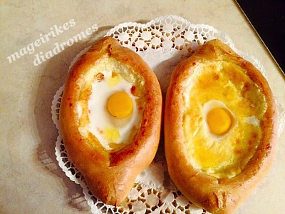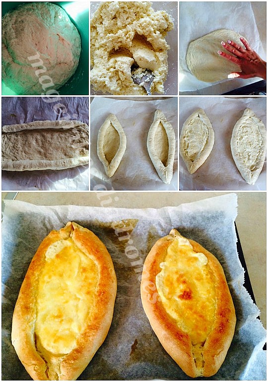 - Όταν φουσκώσει η ζύμη, παίρνουμε κομμάτια στο μέγεθος μεγαλύτερο από καρύδι και τα ανοίγουμε σε σχήμα βαρκούλας (οβάλ σαν το αυγό), όπως σας δειχνω κ στη φωτο βάζουμε την γέμιση και κλείνουμε.
