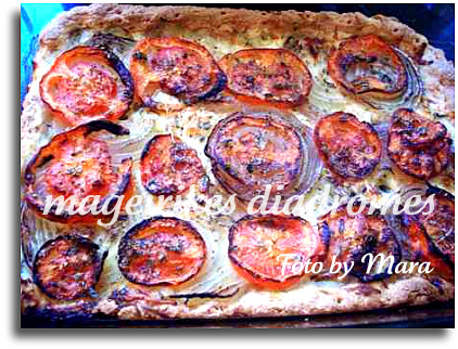 Καλύπτουμε την ζύμη πρώτα με τις ροδέλες κρεμμυδιού μετά με τις ροδέλες ντομάτας.
