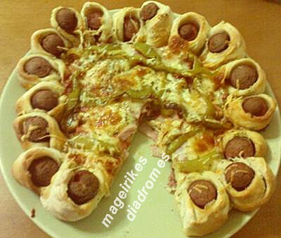 - Ανοίγουμε στρογγυλό φύλλο,βάζουμε γύρω γύρω τα λουκάνικα και γυρίζουμε τις άκρες προς τα μέσα.
